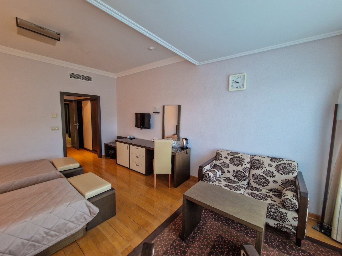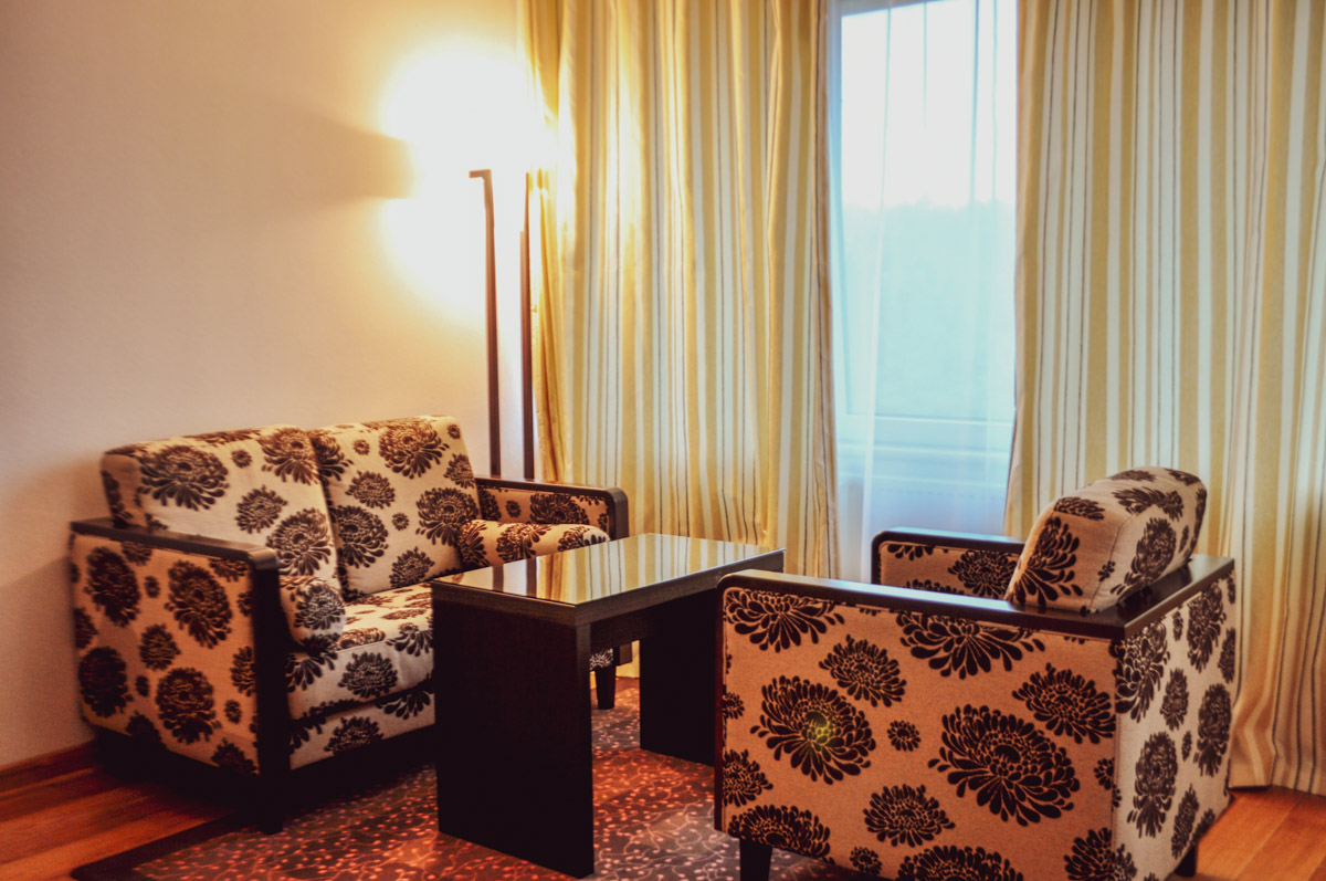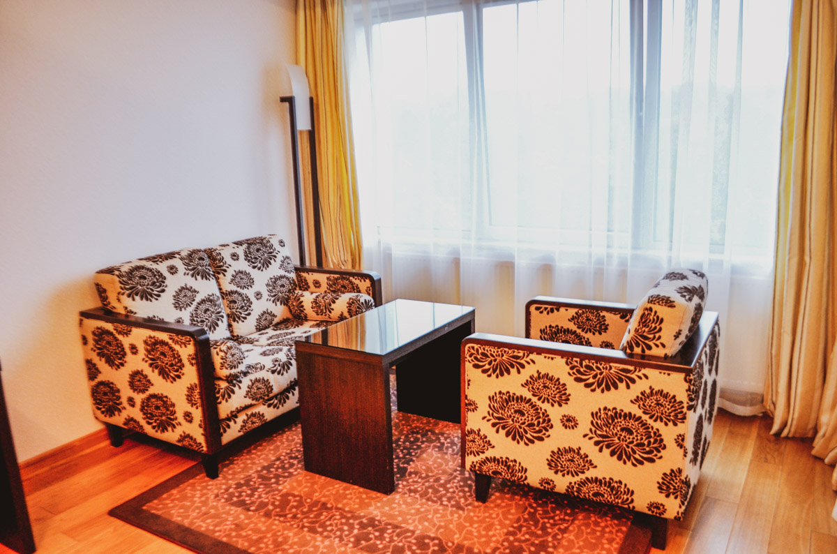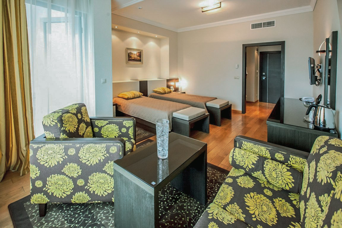 В санатории "Заря" в Кисловодске подготовлены просторные номера общей площадью 42 кв.м, готовые принять от одного до трех человек. Светлый интерьер выполнен в стиле модерн и дополнен текстилем в теплых оттенках. Многоуровневые потолки с точечным освещением делают обстановку еще более уютной, а номер - функциональным.